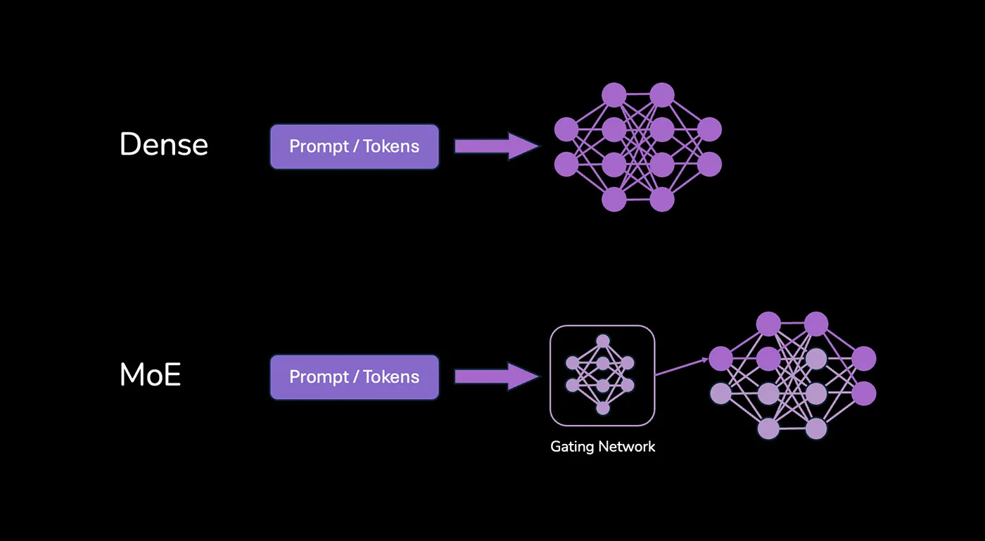 요즘 뜨는 모델은 다릅니다. "전문가 100명이 있는 회사"와 비슷합니다. 논리 전문가, 계산 전문가, 창의적인 업무 전문가가 각각 있습니다. 질문이 들어오면 그중 적합한 전문가 몇 명만 나서서 답합니다. 논리적인 질문이 오면 논리 전문가가 답하고, 나머지 99명은 가만히 있습니다.